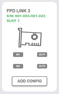When an FG4 PCIe card is inserted into the FG4 Multibox for the first time … (or if no configuration page exists yet), the ADD CONFIG button appears. Pressing ADD CONFIG creates configuration pages for all inputs and outputs associated with the card. These configuration pages are then displayed in the Video Inputs and Video Outputs sections of the main menu.