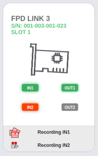 This section lists the FG4 PCIe cards and other hardware currently installed and connected to the system. For FG4 PCIe cards, it displays the status of inputs, outputs, and recording status. For mounted storage devices, clicking on the DISK symbol opens the corresponding storage in File Systems.