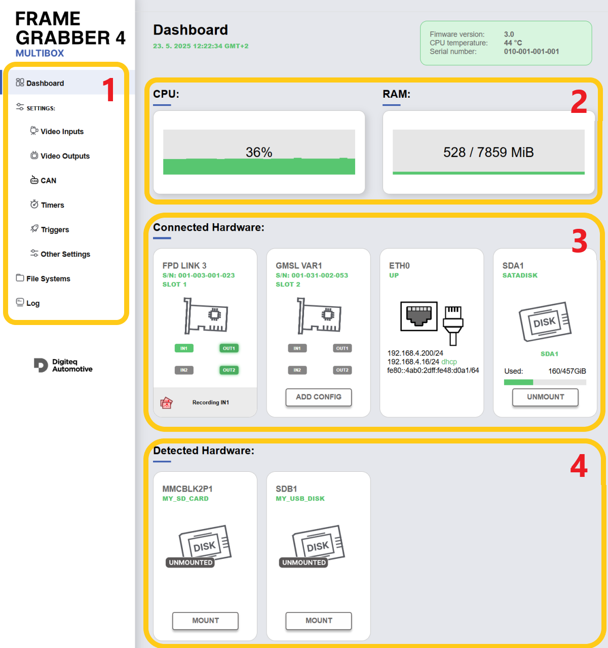 This section displays storage devices that have been detected and can be mounted to the file system. Clicking the "MOUNT" button mounts the device under system device names such as sdb1, sdb2, sdc1, etc. Once mounted, the device will move from the "Detected Hardware" section to the "Connected Hardware" section. The mounted devices are then accessible from the "File Systems" section in the main menu. Before physically disconnecting a storage device, it is recommended to unmount it to ensure data integrity.