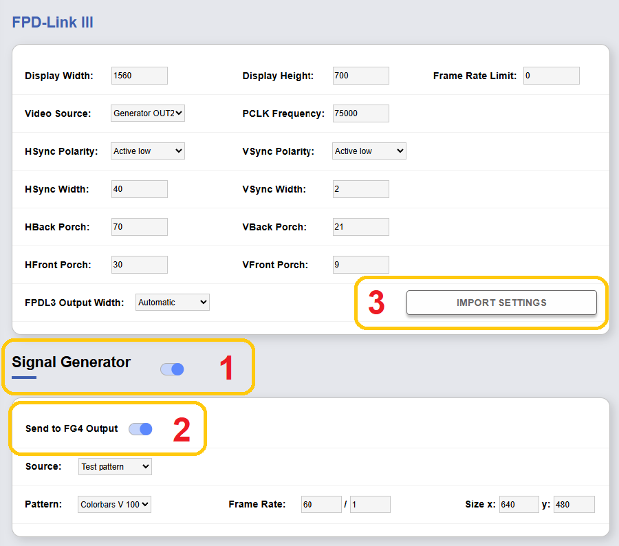 Note: If the Video Source is set to the native Signal Generator ("Generator OUT1" for OUT1 or "Generator OUT2" for OUT2), the GUI automatically enables the "Send to FG4 Output" option.