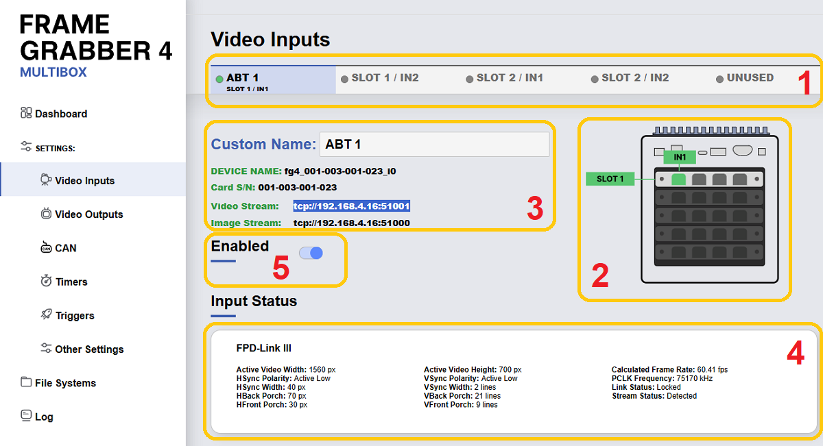 This page shows the video inputs. Let's go through the sections at the top of the input page: